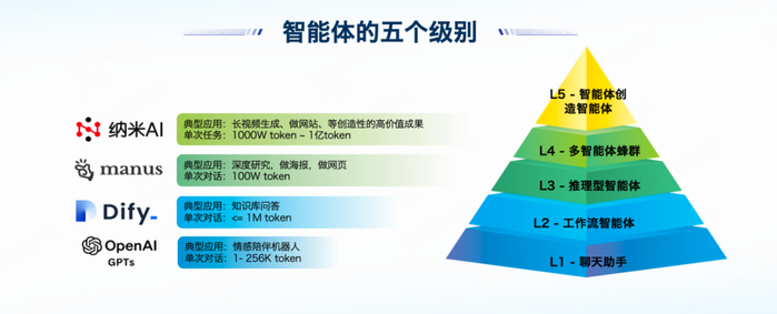 在周鸿祎看来,智能体将按照以下路径演进:L1聊天助手本质上是聊天工具,擅长提建议或提供情感陪伴,属于“玩具级”智能体,比如GPTs。