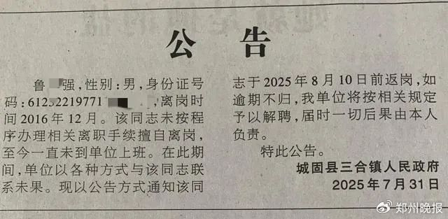 8月1日,陕西汉中城固县三合镇政府登报通知擅自离岗8年的镇干部鲁某强限期返岗,逾期将解聘。经核实,鲁某强系事业编制人员,离岗后工资及福利已停发。城固县委宣传部表示已成立专项调查组全面调查此事。