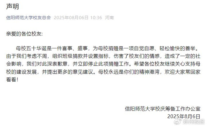 近日,信阳师范大学针对往年毕业生发起50周年校庆“千班万元”捐赠倡议。8月6日,信阳师范大学公开致歉:考虑不周,立即停止此项捐赠工作。