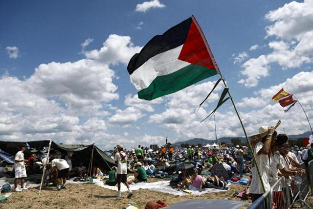 当地时间2025年8月2日,意大利罗马,教皇利奥十六世在托尔维尔加塔主持青年禧年祈祷守夜活动,现场展示着一面巴勒斯坦国旗。视觉中国 图