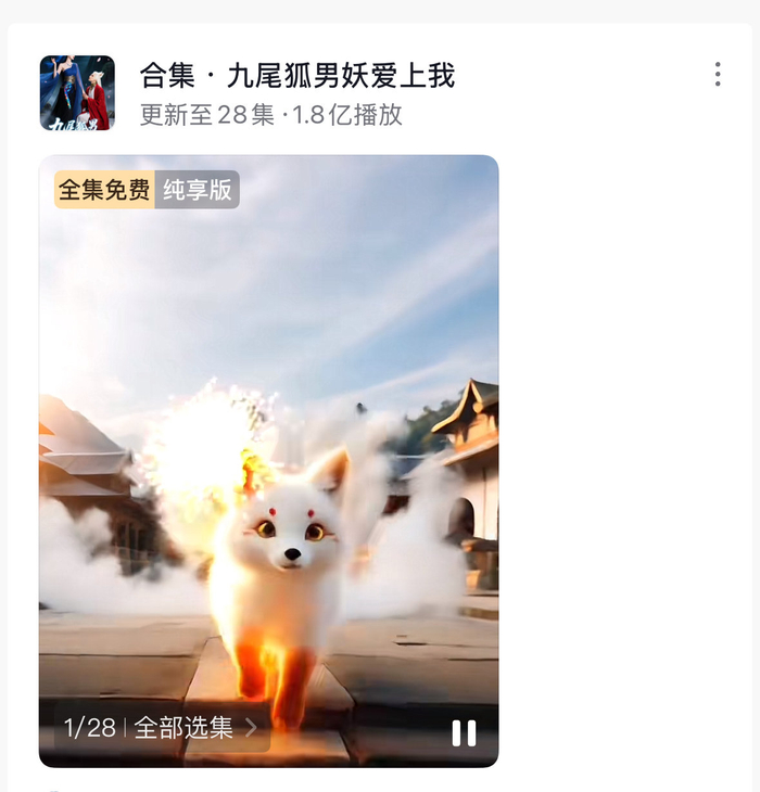 近日,一部名为《九尾狐男妖爱上我》的AI短剧在社交平台上引发热议,其“猎奇”的题材和AI生成的奇幻画面,让观众直呼“好癫,但看得停不下来”。截至8月,该剧已在抖音连更27集,播放量超1.8亿次。