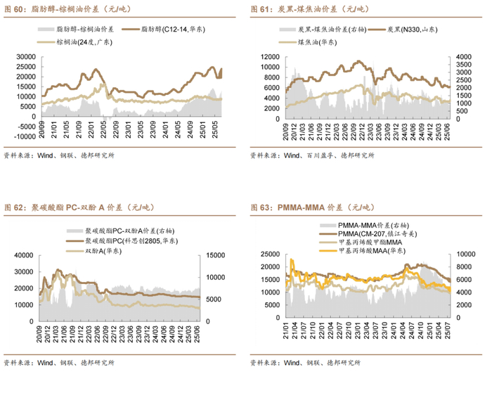 在我们监测的139种化工品中,本周有62种化工品价差上涨,14种化工品价差持平,63种化工品价差下跌。