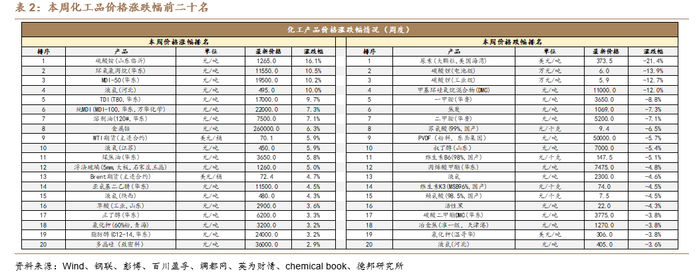本周化工品价格涨幅前十名为:硫酸铵(山东临沂)(+16.1%)、环氧氯丙烷(华东)(+10.5%)、MDI-50(华东)(+10.2%)、液氩(河北)(+10%)、TDI(T80,华东)(+9.7%)、纯MDI(MDI-100,华东,万华化学)(+7.3%)、溶剂油(120#,华东)(+7.1%)、金属钴(+6.3%)、WTI期货(主连合约)(+5.9%)、液氧(江苏)(+5.9%)。
