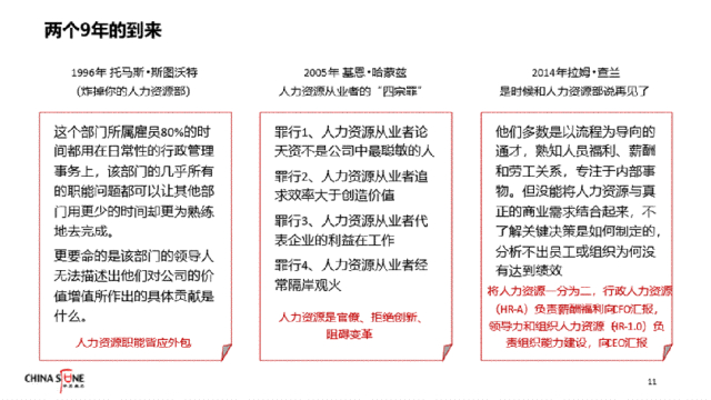第一次转型完成之后,人力资源部门在企业里面的专业形象就建立起来了。之后,迅速遇到了业界所说的“两个九年”。这一点,CHO们一定要知道,我们人力资源部门不但是被别人诟病过的,而且是在很高的层次上被诟病过的。