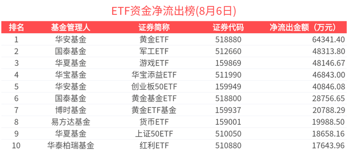 净流出金额超1亿元的有18只,黄金ETF(518880.SH)、军工ETF(512660.SH)、游戏ETF(159869.SZ)、华宝添益ETF(511990.SH)、创业板50ETF(159949.SZ)资金显著流出,分别净流出6.43亿元、4.83亿元、4.81亿元、4.68亿元、4.08亿元(净赎回份额*单位净值)。