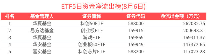 近5天累计净流出超过1亿元的有86只,金额居前的为科创50ETF、创业板ETF、游戏ETF、创业板50ETF、科创芯片ETF等,分别净流出26.20亿元、20.07亿元、16.93亿元、14.74亿元、11.70亿元。其中,科创50ETF近5天资金大幅净流出,基金规模快速下降至882.58亿元。