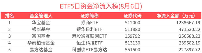 拉长时间看,近5天累计净流入超过1亿元的有95只,金额居前的为券商ETF、银华日利ETF、港股通互联网ETF、恒生科技ETF、科创债ETF易方达等,分别净流入123.87亿元、47.15亿元、25.66亿元、23.97亿元、22.79亿元。其中,券商ETF近5天资金大幅净流入,基金规模快速增长至251.89亿元。