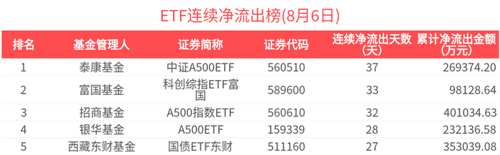 连续净流出的ETF基金有177只,居前的为中证A500ETF(37天)、科创综指ETF富国(33天)、A500指数ETF(32天)、A500ETF(28天)、国债ETF东财(27天),分别净流出26.94亿元、9.81亿元、40.10亿元、23.21亿元、35.30亿元。其中,科创综指ETF富国近33天加速流出,近33天累计流出9.81亿元,基金规模快速下降至8.02亿元。