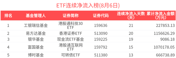 ETF资金榜 | 港股通互联网ETF(159792)资金加速流入,港股通科技30ETF(159636)连续20日吸金-20250806