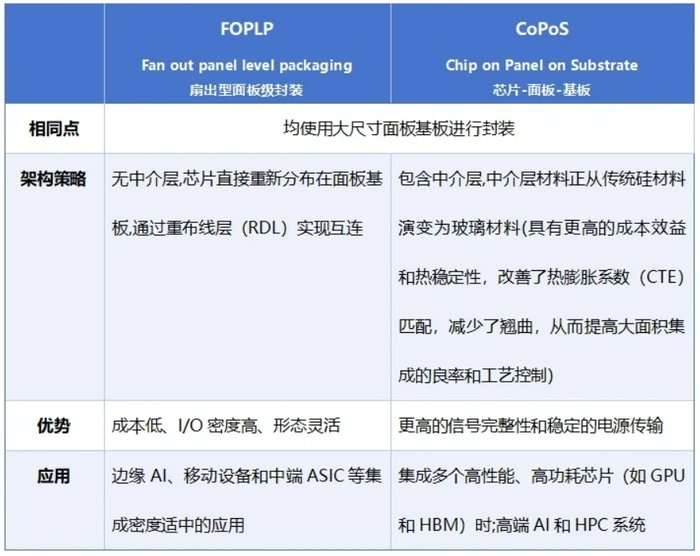 值得注意的是,FOPLP封装技术与面板工艺密切相关,但与上面提到的CoPoS在工艺策略与性能适用上存在差异: