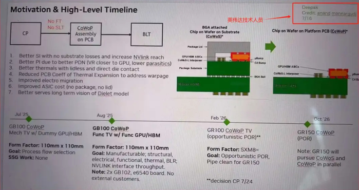 据透露,英伟达被曝计划在Rubin Ultra芯片考虑采用CoWoP。目前CoWoP技术已进入实质性验证阶段:2025年7月,英伟达在内部GB100测试平台(搭载Dummy GPU/HBM,尺寸110mm×110mm)启动机械样板测试;2025年8月将完成结构、电气、热性能及NVLink带宽验证;2026年2月开启GR100平台功能验证,计划2026年10月在GR150平台实现CoWoS与CoWoP并行封装策略。
