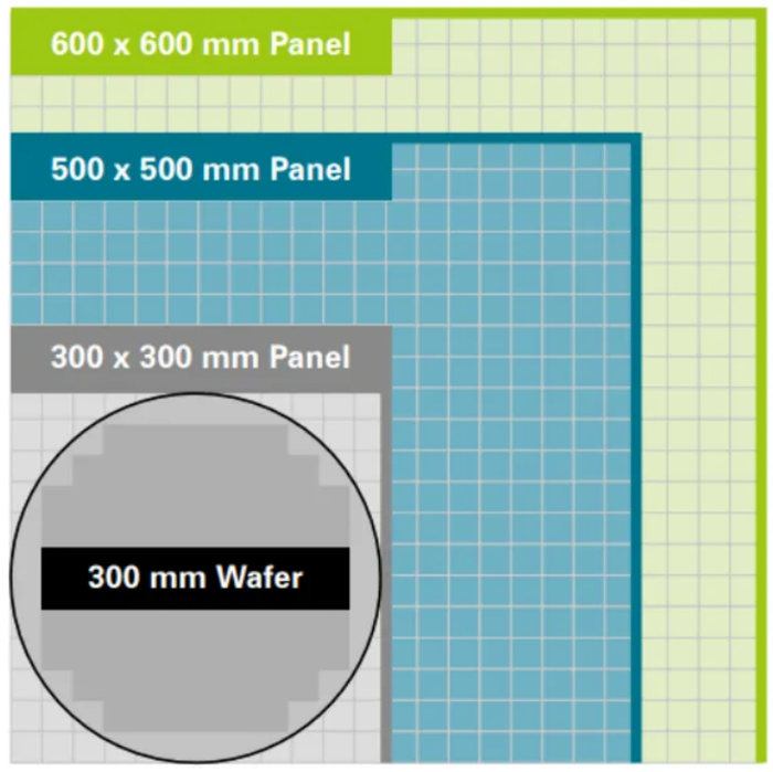 凭借面板级封装优势,采用金属、玻璃或高分子聚合物作为载板,可实现更大封装尺寸与更高生产灵活性。其面积利用率超95%,显著高于传统晶圆级封装的85%,并具备批量生产能力强、成本低、周期短等特点——与圆形晶圆相比,面板型封装的成本可节省20%以上。