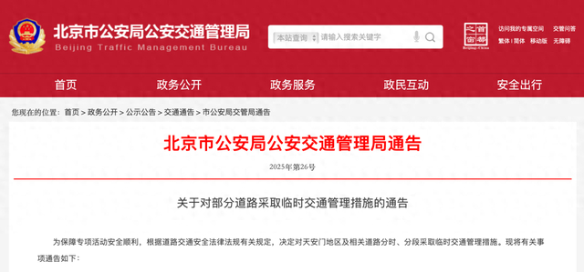 8月6日,北京市公安局公安交通管理局发布关于对部分道路采取临时交通管理措施的通告。