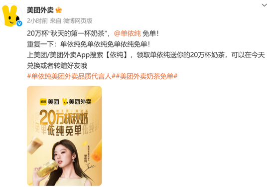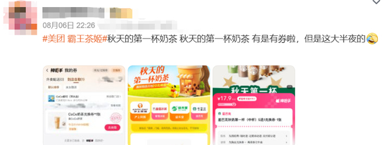 另外,8月7日美团外卖宣布#美团外卖奶茶免单100万杯#今天是最后一天,同时,今天20万杯“秋天的第一杯奶茶”免单!