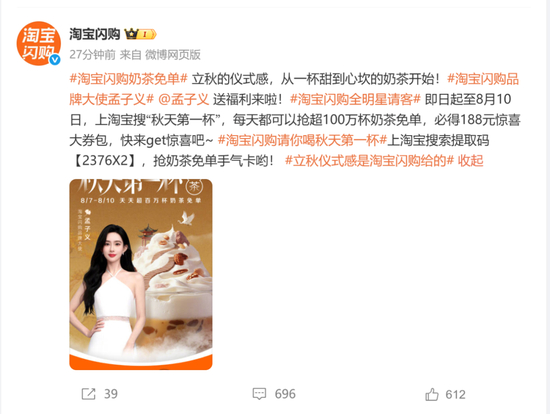淘宝闪购宣布即日起至8月10日,上淘宝搜“秋天第一杯”,每天抢超100万杯奶茶免单。