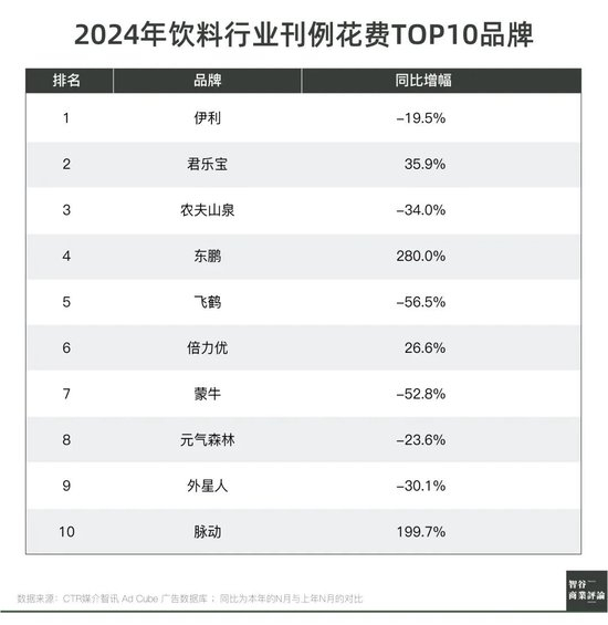据CTR媒介智讯数据,2024年饮料行业刊例花费TOP10品牌中,君乐宝以35.9%的同比增幅仅次于伊利位列第二。在饮料行业户外广告刊例花费TOP10品牌中,君乐宝则以107.4%的同比增幅排名第一。
