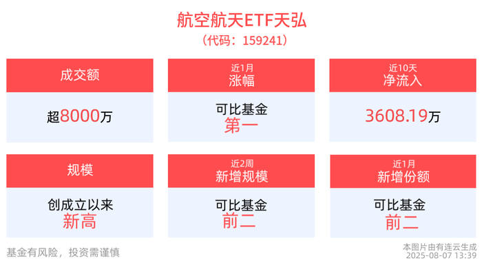 拉长时间看,截至2025年8月6日,航空航天ETF天弘(159241)近1周累计上涨4.14%,涨幅排名可比基金第一。
