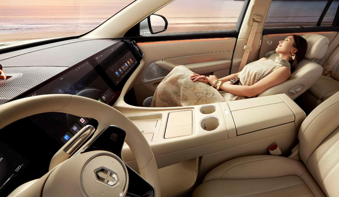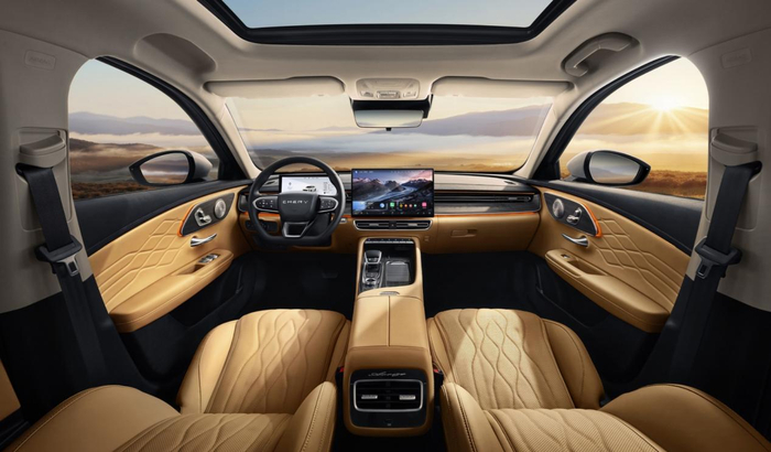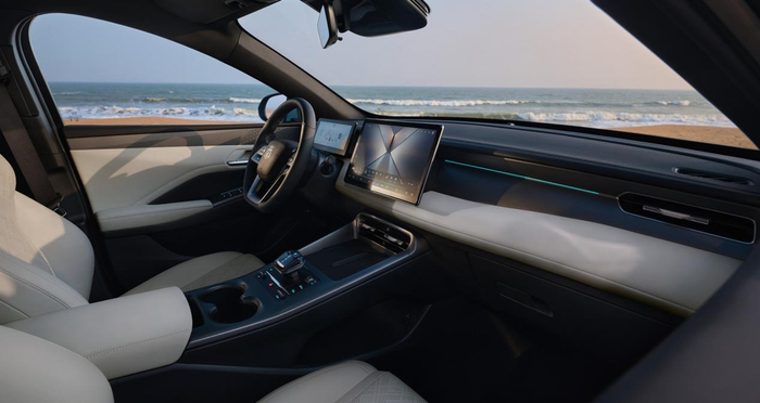 该车内饰增加环绕式氛围灯、NAPPA真皮材质座椅,后排坐垫加长15mm,头枕加宽17mm,提升乘坐舒适性。全景玻璃车顶增加全新采用镀银镀膜材料,能量反射效率提升了7倍,有效阻隔紫外线。全新的自研音响,配有包括1个低音炮在内的16个扬声器,另外后排设置两个USB-C快充接口。