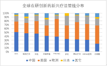 全球在研新兴疗法涵盖基因疗法、细胞疗法、RNA疗法、ADC、双/多抗、核药等前沿技术,处于爆发式增长期,基因疗法、RNA疗法、ADC、双抗等技术路线成为主力,美国占全球新兴疗法管线数量超过40%,在基因/细胞疗法、mRNA、ADC等领域持续领先,中国新兴疗法管线数量大幅增加,其中ADC、双抗、细胞疗法为主要增长点,目前中国已成为仅次于美国的全球第二大新兴疗法研发国。