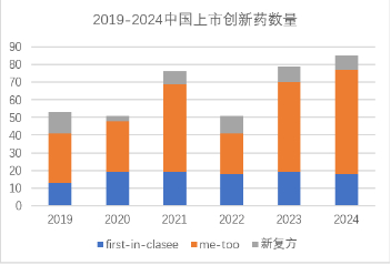 2019-2024年间,中国创新药整体呈现增加趋势,由2019年的53个波动上升至2024年的85个,复合增长率约10%,创新药上市数量增加或标志中国医药生物行业步入原创药产出周期的历史拐点,商业化加速,经营现金流反哺创新药研发,中国创新药预期将加速迭代。