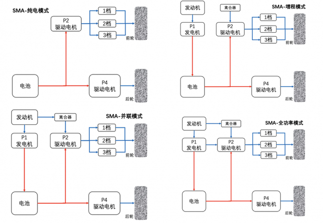 模式更丰富:纯电(P2+P4驱动)、并联(发动机+P2+P4驱动)、全功率(发动机+P1+P2+P4驱动)、直驱(发动机驱动)、增程(P2+P4驱动,P1发电)、充电(P1发电)、能量回收(P2+P4制动回馈)。