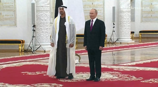 当地时间7日,俄罗斯总统普京在克里姆林宫会见到访的阿联酋总统谢赫·穆罕默德·本·扎耶德·阿勒纳哈扬。