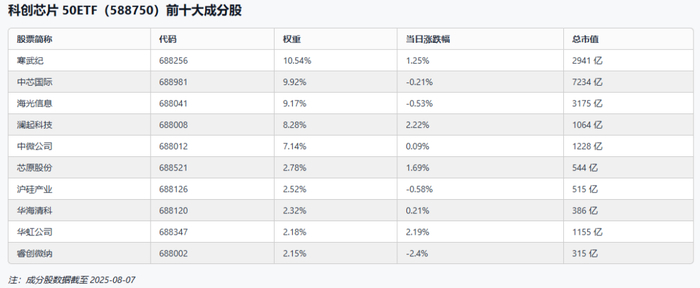 ETF 十大重仓个股中,澜起科技和华虹公司涨幅居前,分别上涨 2.22%和 2.19%;睿创微纳表现较弱,下跌 2.4%。其他重仓股中,寒武纪上涨 1.25%,中芯国际下跌 0.21%,海光信息下跌 0.53%。