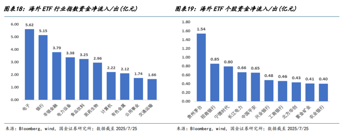 海外 ETF 持仓 A 股资金 2025 年 7 月净流入 44.41 亿元(截至2025/7/25),延续 2025 年 6 月的流入态势,环比流入幅度显著增长,体现外资(交易型)对 A 股市场的态度的边际转暖。外资增持方向与 A 股的成交热度一致,在反内卷政策、大型基建项目落地、世界人工智能大会召开等因素的推动下,7 月中下旬资金流入更为显著。