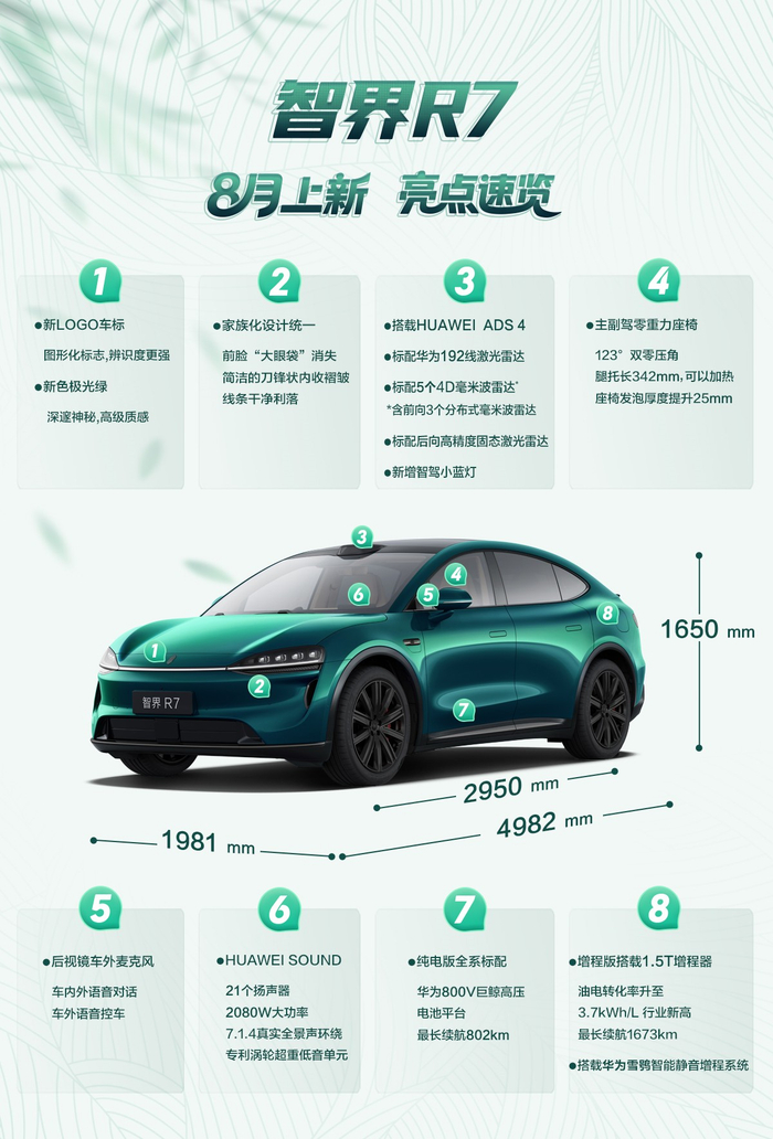 现有产品线中,智界S7是品牌首款轿车,智界R7则以轿跑SUV定位曾销量超越特斯拉Model Y成为细分市场冠军。如今它们的新款车型将于8月8日启动小订,新增后向高精度固态激光雷达和4D毫米波雷达,对静态障碍物识别率提升至99.6%,夯实同级辅助驾驶领先地位。