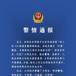 中新网8月8日电 西藏昌都市八宿县公安局8月7日通报:近日,有网友在网络平台发布消息称“有人在318国道放置特制铁块,沿线多辆车‘中招’爆胎,目前铁块已移交当地派出所”,消息发布后,引发广大网友关注。接此警情,昌都市、八宿县两级公安机关高度重视,立即组织相关部门开展调查。目前,相关工作正在积极有序开展中,调查结果将及时向社会公布。
