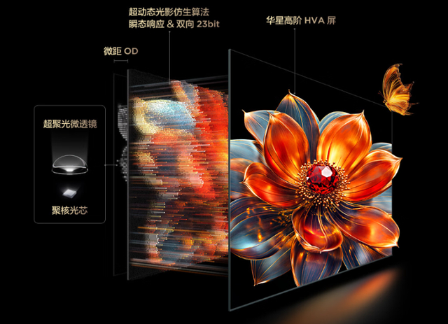 QM8K的背光系统搭载聚核光芯与第四代超聚光微透镜,前者通过超能高光晶底与原子级工艺,实现亮度提升40%、光效提升50%;后者凭借34项自研专利,让光线集中度提升41.2%,避免相邻分区的溢光干扰。配合微距OD技术(背光灯板到扩散板距离缩减至“微距级”),整机厚度控制在60mm以内,远薄于普通电视的70mm以上,使得每个分区的光线都能精准锁定显示区域。
