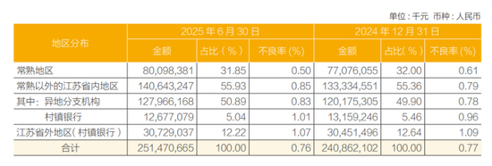 另外,常熟银行吸收合并的村镇银行大都位于异地。2025年上半年,常熟银行在常熟以外地区营业收入占比66.52%,拨备前利润占比66.62%。对比2024年,常熟银行在常熟以外地区的营业收入、拨备前利润占比已达到73.52%、80.48%。