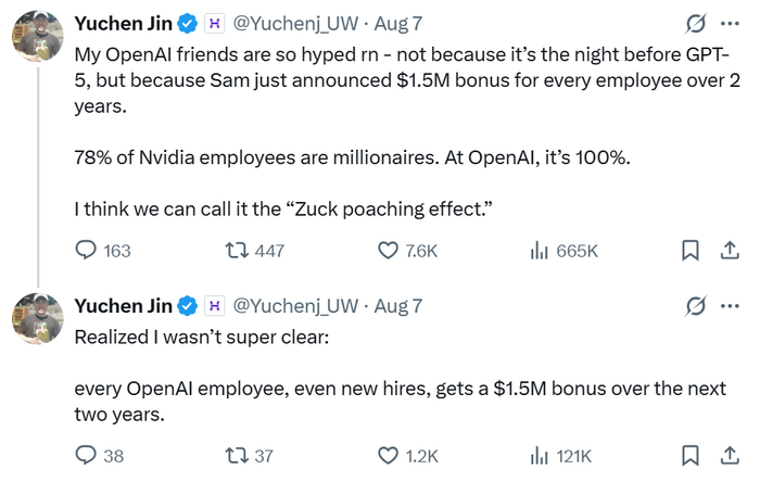 Hyperbolic Labs联合创始人兼首席技术官Yuchen Jin最新爆料称,“我在OpenAI的朋友们现在都超级兴奋,不是因为GPT-5发布的前夜,而是因为Sam刚刚宣布给每位员工发150万美元的两年奖金。”