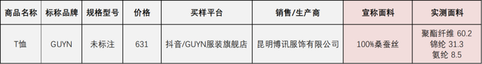 测评结果发现:有1款样品虽宣称面料为100%桑蚕丝,但实际并未测出含真丝成分。有3款样品的宣称克重与实测结果有差别,其中有2款数据差异较大。有3款样品的水洗尺寸变化率超过标准限定范围。