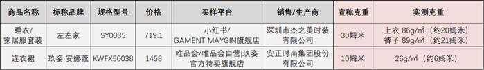 表2 2款面料克重实测与宣称差距较大的样品信息