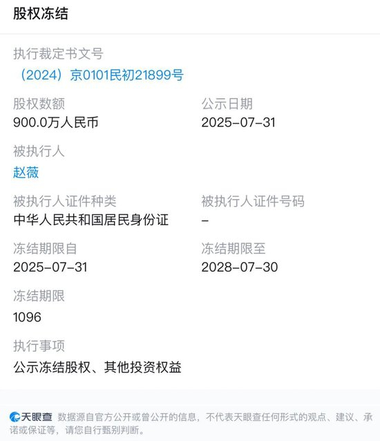 2025年7月末,北京市东城区人民法院连续对赵薇下达三份股权冻结裁定。赵薇名下三家公司的股权被冻结,总额达1590万元。其中,芜湖东润发投资有限责任公司(赵薇持股90%)被冻结的900万元股权。西藏龙薇文化传媒有限公司(赵薇持股95%)、合宝文娱集团有限公司(赵薇持股4.51%)分别被冻结190万、500万,冻结期限均为三年。从今年7月底至2028年7月底期间,冻结股权将被禁止转让或质押。执行依据为法院裁定书((2024)京0101民初21899号。