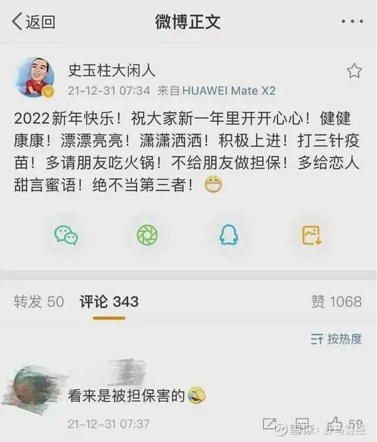 在2021年的最后一天,史玉柱还曾经发过一条意味深长的微博。他说:“多请朋友吃火锅!不给朋友做担保!”