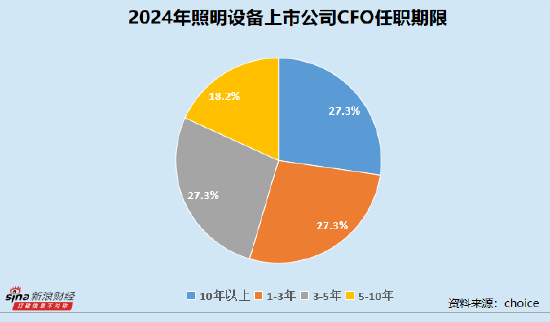 就任职期限而言,2024年照明设备上市公司CFO任职期在10年以上、1-3年和3-5年各占比27.3%,5-10年占比最小,约为18.2%。任职时间最长的是得邦照明朱国星,他自2013年1月起担任公司财务总监,至今已超12年。