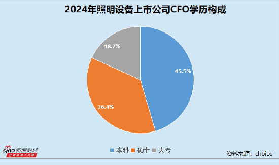 就学历构成而言,在11位照明设备上市公司CFO中,45.5%为本科学历,硕士约占比36.4%,专科占比18.2%。立达信夏成亮和海洋王朱立裕最高学历为大专。