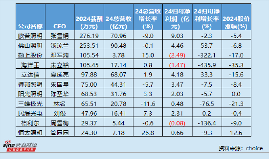 统计区间内,共有8位CFO涨薪、3位CFO降薪。海洋王朱立裕涨幅最高,由2023年的38.81万显著增长171.71%至105.45万元;其次是阳光照明陈圣华,由2023年的35.02万元显著增长95.69%至68.53万元。格利尔周雪梅降幅最高,较2023年降低42.23%至29.37万元。