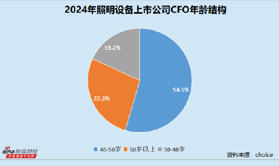 2024年照明设备上市公司CFO群体年龄结构呈现中年化特点,整体平均年龄为45.73岁,其中54.5%的CFO年龄处于40至50岁区间,27.3%在50岁以上,仅有18.2%处于30-40岁之间。综合性别分析,男性CFO占比63.6%,平均年龄45.29岁;女性CFO约占36.4%,平均年龄为46.50岁。