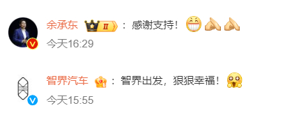 在李连杰的这条博文下,华为常务董事、终端BG董事长余承东以及智界汽车官博都有留言感谢、祝福。