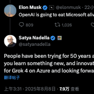 针对马斯克昨天试图“离间”OpenAI和微软的举动(称“OpenAI将吞噬微软”),以及微软CEO纳德拉打趣回应“人们已经尝试50年了”(微软今年创立50周年),奥尔特曼也发表了不屑的回应。