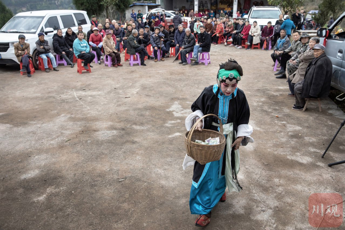 2023年3月,南充市仪陇县铜鼓乡,李丹拿着竹筐走向戏台,筐里装着观众打赏的小费。