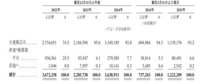 互连类芯片为澜起科技最主要的收入来源,业务收入占比各期总收入的74.5%、95.6%、92.0%及93.2%,而公司各期来自津逮®服务器平台的收入占比分别为25.5%、4.1%、7.7%及6.6%。