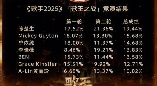“歌王”归属尘埃落定,陈楚生荣获总决赛冠军,亚军为美国歌手米奇·盖顿(Mickey Guyton),单依纯、马来西亚歌手李佳薇、日本歌手红(Beni)、美国歌手格瑞丝·金斯勒(Grace Kinstler)、黄丽玲(A-Lin)分获三至七名。