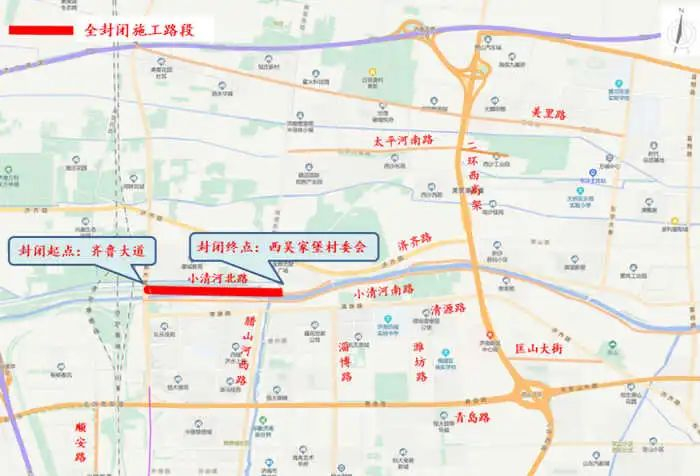 封闭道路范围:封闭小清河北路与齐鲁大道交叉口东口、小清河北路与腊山河西路交叉口北口、小清河北路与西吴家堡村委会交叉口西口。