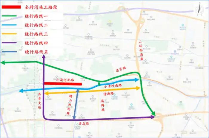封闭道路范围:封闭小清河北路与齐鲁大道交叉口东口、小清河北路与腊山河西路交叉口北口、小清河北路与西吴家堡村委会交叉口西口。