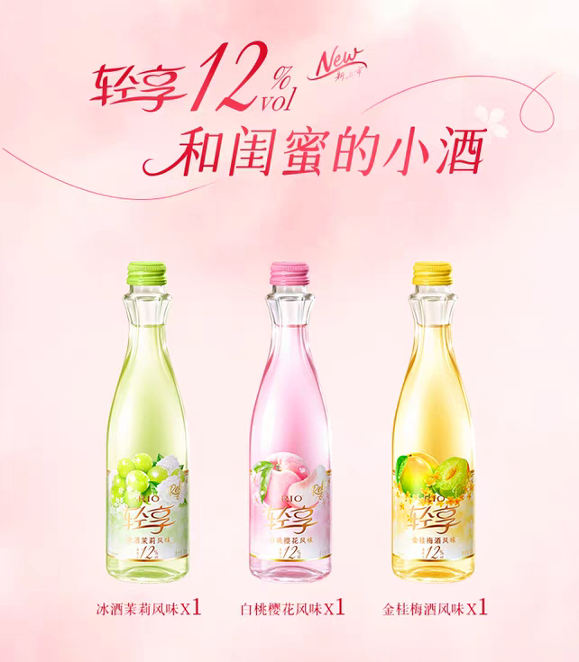 据了解,该产品共推出金桂梅酒、冰酒茉莉,以及白桃樱花等3种风味,每瓶300毫升,单瓶终端售价29.9元,6瓶装售价129元,目前主要在线上销售。在官方宣传中,RIO锐澳将产品目标客群仍定位为女性,打出“和闺蜜的小酒”“微醺小酒”“女性伴手礼”等标签。