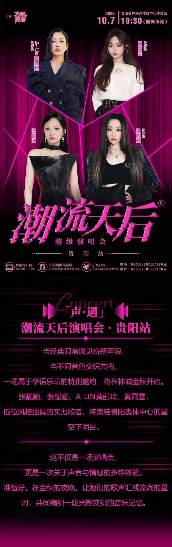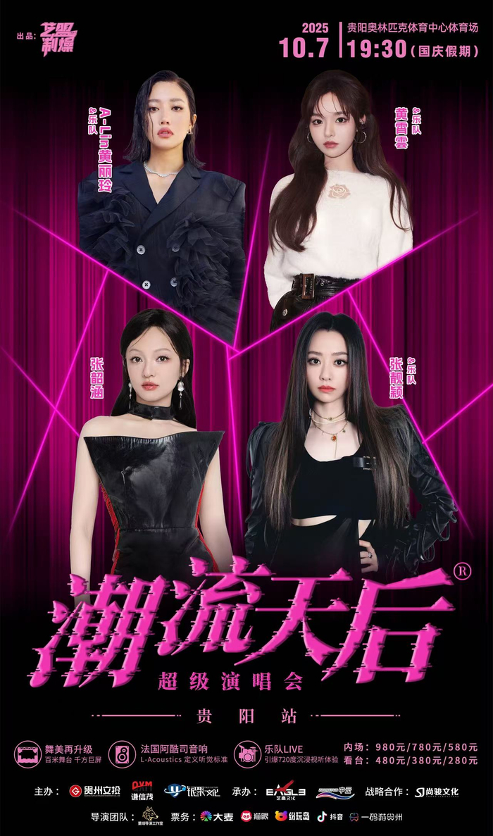 准备好你的热情与尖叫,与张靓颖、张韶涵、黄丽玲、黄霄雲一起,在贵阳的夜空下,引爆属于2025年的最强音乐宇宙!